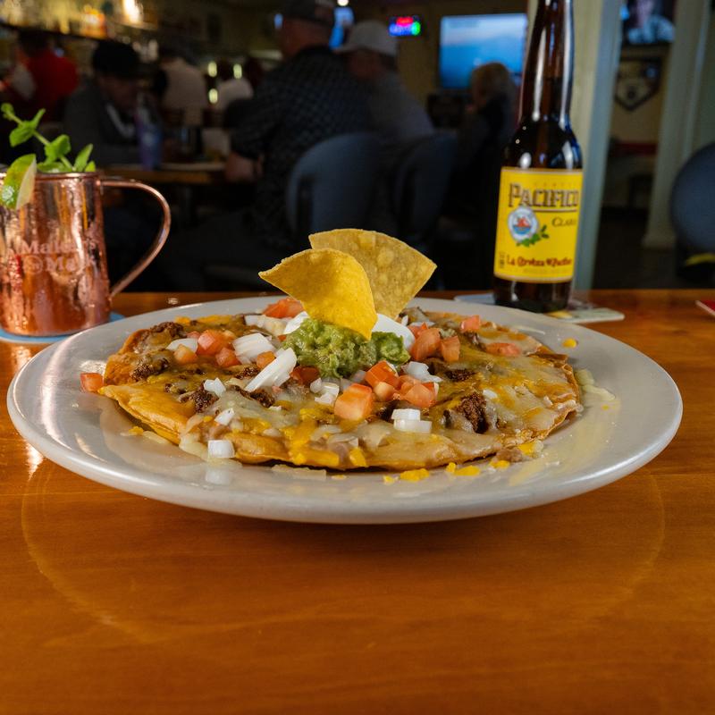 Crispy flour tortillas with beans, onions, and our choice of chicken or ground beef. Topped with enchilada sauce. Green onions, guacamole, and sour cream. Shredded Beef +$2.00