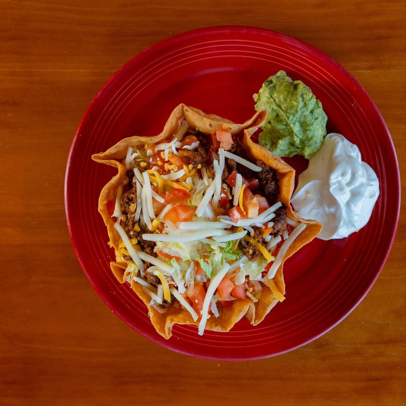 A flour tortilla bowl filled with lettuce, tomato, cheese, and your choice of chicken, beef, or picadillo, shredded cheese, served with guacamole and sour cream.