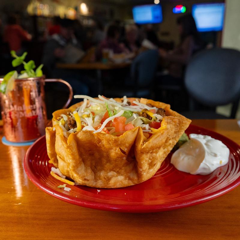 A flour tortilla bowl filled with lettuce, tomato, cheese, and your choice of chicken, beef, or shredded beef, served with guacamole and sour cream.